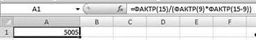 ) Для вычисления воспользуемся функцией "ФАКТР". В свободную ячейку вводим формулу: =ФАКТР(15)/(ФАКТР(9)*ФАКТР(15-9)).