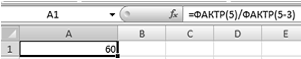 ) Для вычисления воспользуемся функцией "ФАКТР". В свободную ячейку вводим формулу: =ФАКТР(5)/ФАКТР(5-3) (рис. 13).