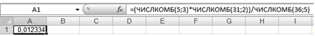 свободную ячейку вводим формулу: =(ЧИСЛКОМБ(5;3)*ЧИСЛКОМБ(31;2))/ЧИСЛКОМБ(36;5)