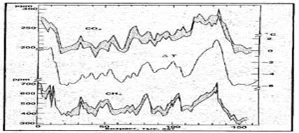 Содержание другого углеродного соединения - метана - в древней атмосфере также тесно связано с ходом палеотемператур. Резкие изменения концентрации метана приходятся на оба ледниково-межледниковых перехода: 150-135 тыс. и 18-9 тыс. лет назад. В эти периоды она резко возрастала (от 0,35 ppm в разгар оледенения до 0,6-0,7 ppm в межледниковые оптимумы). Для валдайской ледниковой эпохи характерны четыре максимума содержания СН4 во время относительно теплых интервалов, что не так заметно в ходе изменений CO2.