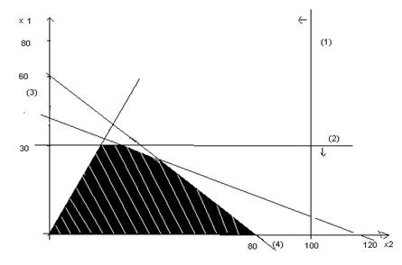 Решим данную задачу графическим методом. Для этого на графике отметим координаты прямой (1/120)x1+(1/40)x2=1, она проходит через точки (0,120) и (40,0) и координаты прямой (1/80)x1+(1/60)x2=1, которая проходит через точки (0,80) и (60,0).Также отметим на графике x1=100 и x2=30 (рисунок 3).