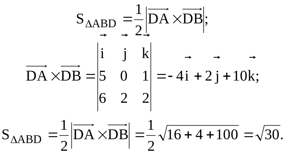 Найти площадь треугольника с вершинами в точках А(1, 3, 0); В(2, 5, 0); D(-4, 3, -2).