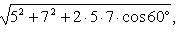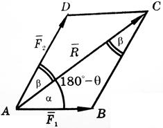 F1 = 5, F2 = 7, угол между ними θ = 60°. Определить также углы α и β, образуемые равнодействующей с силами и .