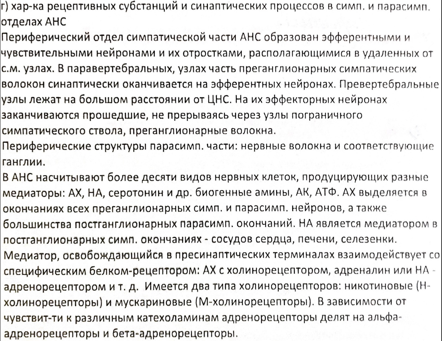 Одностороннее проведение нервных импульсов в межнейронных синапсах, перекрытие зон влияния отдельных входящих в узел преганглионарных волокон, наличие временной и пространственной суммации и окклюзии показывают, что нейроны и синапсы ганглиев вегетативной нервной системы обладают такими же свойствами, что нейроны и синапсы Ц.НС.