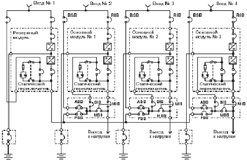 любой из ИБП или любой участок цепи может быть отключен без потери напряжения
