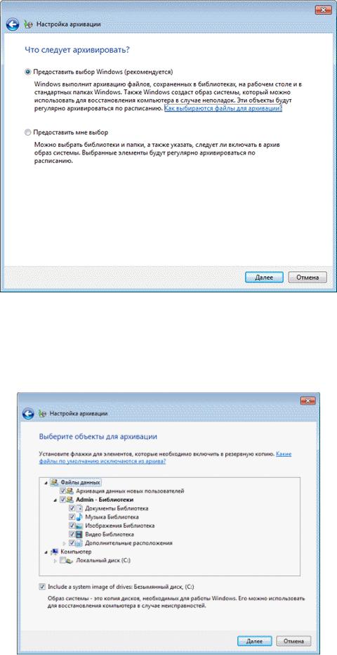 Далее рассматривается сохранение резервной копии на раздел внутреннего жесткого диска. Определившись с размещением архива, вы должны задать параметры архивации. Можно предоставить это решение операционной системе, а можно выбрать папки самостоятельно.