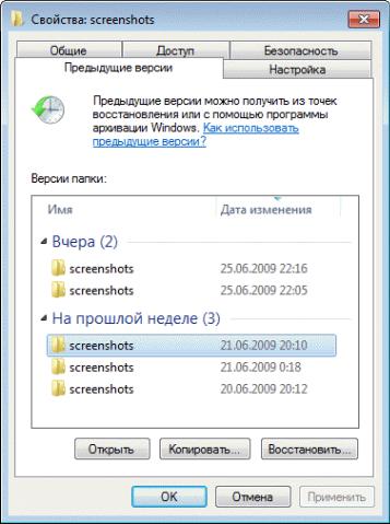 В отличие от файла, сохраненного в архиве, в этом случае вам будут доступны варианты открытия и копирования файла в выбранную вами папку.Помимо отдельных файлов, из теневых копий можно восстанавливать папки. Список версий можно увидеть в свойствах папки на вкладке «Предыдущие версии».