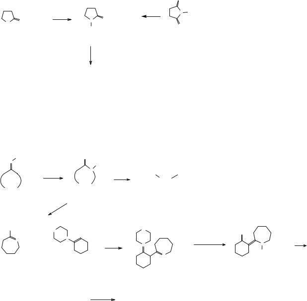 Для синтеза аминокислот с большим расстоянием между карбоксильной и аминогруппой в качестве исходных соединений используются лактамы. Выше на примере капролактама приведена реализуемая при этом последовательность реакций. При взаимодействии капролактама с пентахлоридом фосфора образуется имидоилхлорид – циклический аналог хлорангидрида карбоновой кислоты, соответствующий тому, что атом кислорода заменен атомом азота. Обладая реакционной способностью, близкой к реакционной способности хлорангидридов, соединения этого типа реагируют с енаминами с образованием иминиевой соли, гидролиз которой разбавленной уксусной кислотой приводит к енаминокетону. Енаминокетоны – соединения близкие по реакционной способности к β-дикетонам и поэтому, способные при взаимодействии с концентрированными щелочами вступать в обратную реакцию Кляйзена, в результате чего в данном случае углеводородная цепь аминокислоты удлиняется на шесть углеродных атомов, которые ранее находились в циклогексановом кольце используемого енамина.