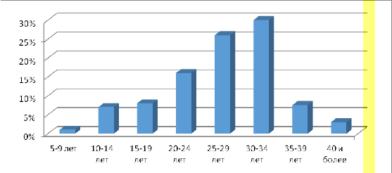 Максимальный риск возникновения профессионального заболевания проявляется у работников (как мужчин, так и женщин) при контакте с вредным производственным фактором в течение 30-34 лет (рис. № 15). 5 случае профессиональных заболеваний выявлены при стаже в контакте с вредным фактором в течение более 40 лет.