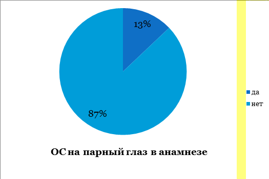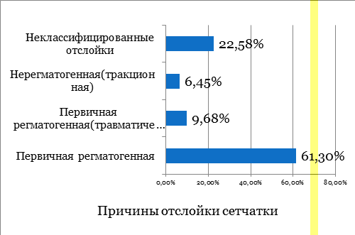 В литературе [11], регматогенная отслойка сетчатки в 10% случаев двухсторонняя, среди пациентов в нашей группе ОС на парный глаз в анамнезе у 12,90% (4 человека).