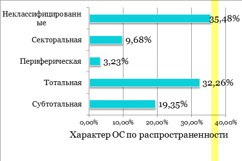 Среди прооперированных больше пациентов с тяжелыми отслойками - тотальной и субтотальной (32,26% и 19,35%).