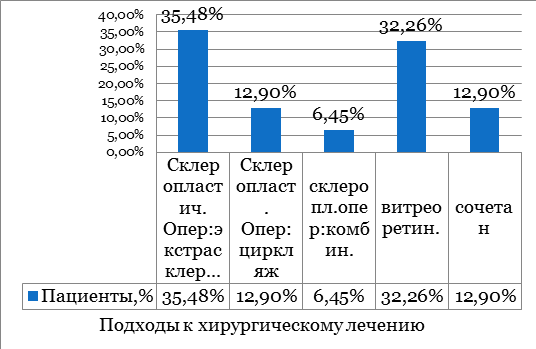 . Процент экстрасклеральных методов лечения ОС превышает интраокулярные: склеропластические операции 54,83%, витреоретинальные 32,26%, сочетанные операции (витреоретинальные+склеропластические) 12,90%.