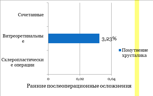 Среди всех прооперированных(36 человек) раннее осложнение было у 1 человека (помутнение хрусталика) после витреоретинального вмешательства с введением газа в полость стекловидного тела.
