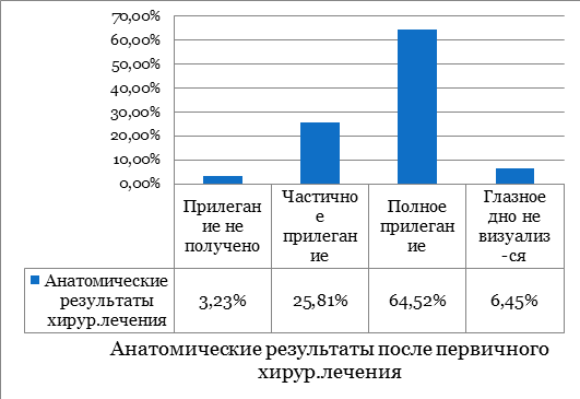 глаз), прилегание не получено (тотальная отслойка) 3,23%(1 глаз), глазное дно