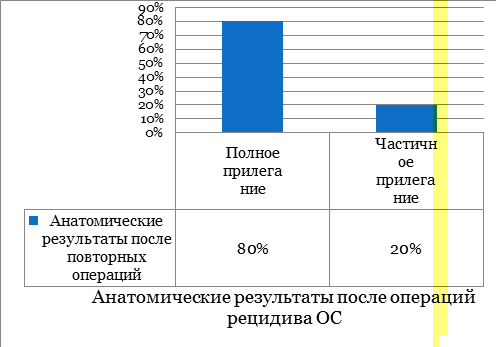 . Положительный анатомический результат после первичного оперативного вмешательства (полное прилегание) 64,52%(20 глаз); после операций рецидива 80% (4 глаза).
