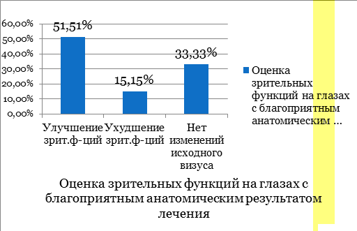 . Положительный функциональный результат на глазах с благоприятным анатомическим результатом лечения - увеличение визуса 51,51%(17 глаз)
