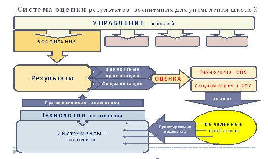 Одним из основных объектов управления в школе является воспитание как процесс, направленный на определённые результаты. В определении результатов мы остановились на ценностных ориентациях и социализации учащихся. Измерять данные результаты воспитания возможно с помощью апробированных диагностических методик СПС и социометрии. Результаты оценочных процедур анализируются с целью выявления проблем в процессе воспитательной деятельности и корректировки процесса воспитания посредством технологий воспитания как технологий воздействия на результаты воспитания обучающихся.
