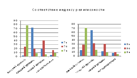 При рассмотрении показателей индекса религиозности личности, выявлено, что 20% школьников 7а класса, 39,1% школьников 7б класса, 54,5% школьников 7в класса имеют низкую степень индекса религиозности личности; 26,1% школьников 7б класса, 13,6% школьников 7в класса определили высокий уровень индекса религиозности личности.Результаты повторного тестирования демонстрируют позитивную динамику по данному показателю