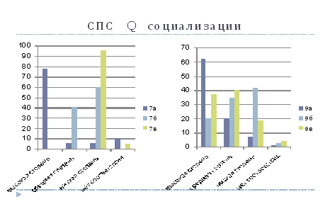 При рассмотрении показателей индекса социализации личности, выявлено, что 5% школьников 7а класса, 60,9% школьников 7б класса, 95,5% школьников 7в класса имеют низкую степень индекса социализации личности; 75% школьников 7а класса определили высокий уровень индекса социализации личности.