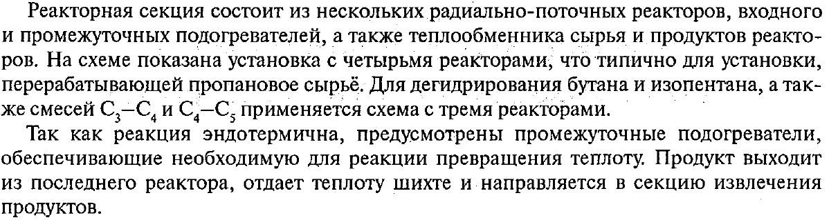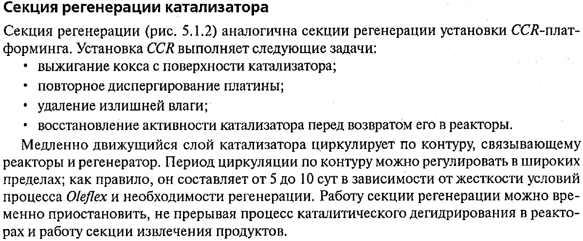 Регенерация осуществляется с псевдоожнженным слоем катализатора при противотоке газа-окислителя, поступающего под нижнюю распределительную решетку регенератора. Поскольку необходимо избегать перегревов, ведущих к дезактивированию катализатора, проводят регенерацию смесью воздуха с газами сгорания топлива, содержащей только 2—3% (об.) кислорода. При этом оксид хрома все же частично окисляется в CrO3, и при восстановлении последнего в реакторе образуется вода, вредно влияющая на свойства катализатора. Во избежание этого в десорбер регенератора подают топочный газ, восстанавливающий катализатор, и еше ниже - азот, отдувающий пары воды и газы сгорания. После этого регенерированный катализатор при 610—650 °С подхватывается транспортирующим газом и возвращается в реактор.