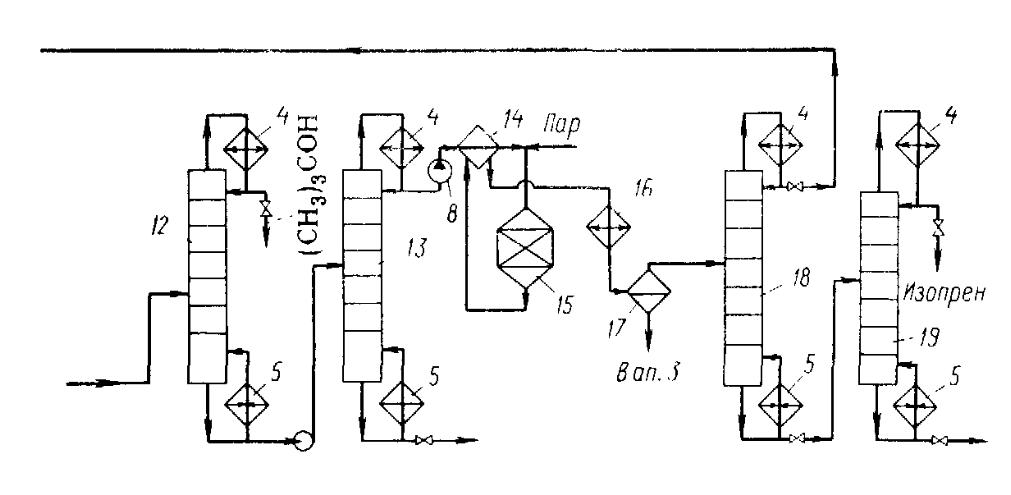 Органический слой с верха сепаратора 17 подают последовательно в две ректификационные колонны. В первой (18) отгоняют образовавшийся при разложении диоксана изобутен, который возвращают на первую стадию синтеза. Затем в колонне 19 отделяют изопрен от более высококипящего остатка (непревращенный диоксан и побочные продукты). Для окончательной очистки изопрен промывают водой, осушают азеотропной перегонкой и проводят заключительную ректификацию. На этих стадиях к нему во избежание полимеризации добавляют ингибитор.