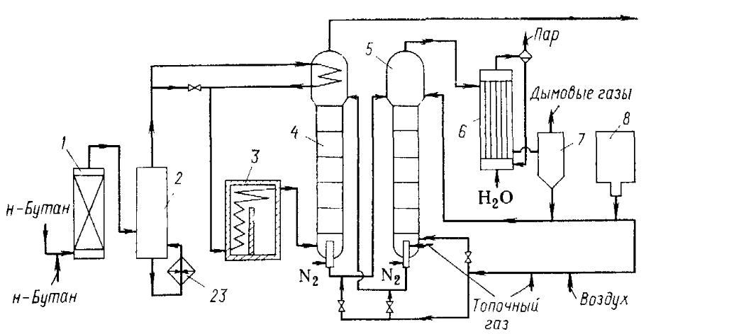 Свежий и рециркулируюший бутан в жидком виде посгупают в осушитель 1, заполненный адсорбентом (Al2O3, цеолиты), а затем в испаритель 2. Образовавшиеся пары подогреваются в трубчатой печи 3. имеющей конвективную и раднантную секции, до 540--550°С и поступают под распределительную решетку реактора 4 на дегидрирование. В нем имеется несколько провальных тарелок, которые делят реакционный объем на секции, препятствуя смешению и струйному потоку газов. Регенерированный катализатор подают на верхнюю распределительную решетку, и, следовательно, псевдоожижеииый слой катализатора и реакционные газы движутся противотоком друг к другу, что создает наиболее благоприятный режим процесса (более горячий катализатор контактирует с частично прореагировавшей смесью и, наоборот, чем достигается выравнивание скоростей реакции но всему объему).