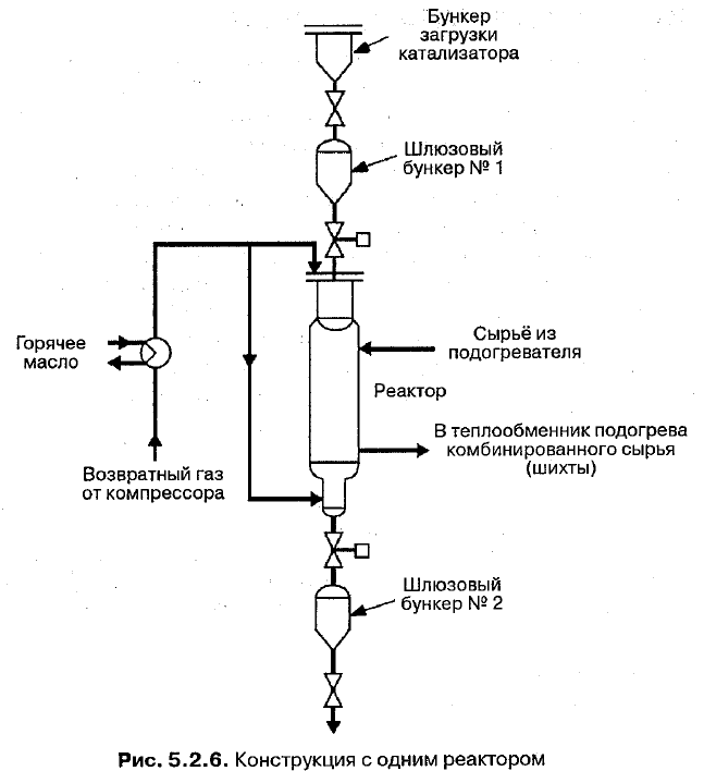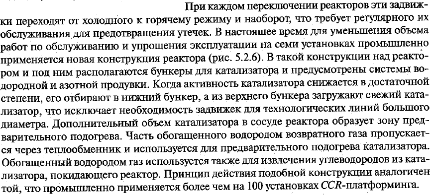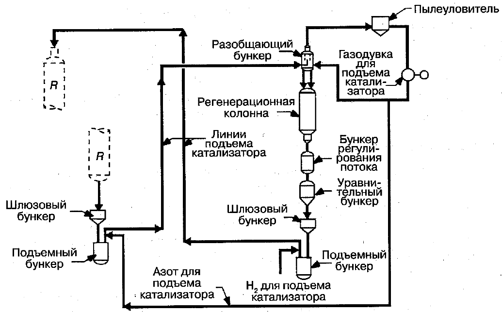 Закоксованный катализатор с низа реактора 4 стекает по специальной трубе (десорбер), в которой его отдувают от углеводородов азотом. Затем катализатор подхватывается потоком горячего транспортирующего газа (воздух + газы сгорания топ-лива) и при помощи этого пневмотранспорта поступает на верх регенератора 5. Последний также имеет распределительную и несколько провальных решеток, которые делят его объем на секции.