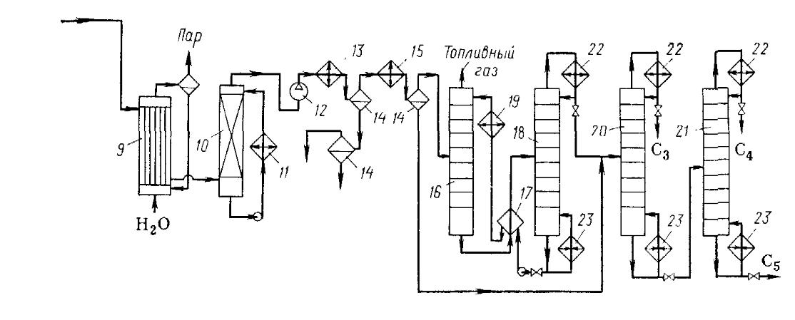 Их сжимают в компрессоре 12 до 1,3 МПа и охлаждают водой в холодильнике 13; из конденсата отделяют воду в сепараторе 14. Затем газ дополнительно охлаждают в рассольном холодильнике 15. Несконденсировавшийся газ, состоящий из водорода, СО и низших углеводородов, поступает в абсорбер 16, орошаемый фракцией C5, которая улавливает захваченные газом пары С4 и частично С3. Кубовая жидкость этого абсорбера через теплообменннк 17 направляется в отпарную колонну 18, в кубе которой собирается фракция C5, направляемая через теплообменник 17 и холодильник 19 на орошение абсорбера 16.