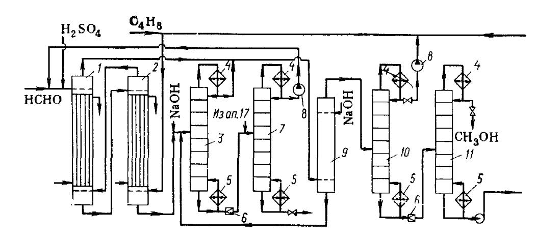 Углеводородный слой с верха реактора 1 и легкий погон ректификации водного слоя объединяют и обрабатывают в нейтрализаторе 9 движущимся противотоком водным раствором щелочи, который после этого смешивают с водным слоем, выходящим из реактора 2, подавая на совместную переработку, описанную выше. Из промытого углеводородного слоя в колонне 10 отгоняют непревращенный изобутен, возвращая его на реакцию. Затем в колонне 11 из продуктов реакции отгоняют более летучие метанол и метилаль, а в колонне 12 – трет-бутанол. Диоксан (вместе с насыщенными спиртами) отделяют в колонне 13 от тяжелого остатка и направляют на вторую стадию процесса.