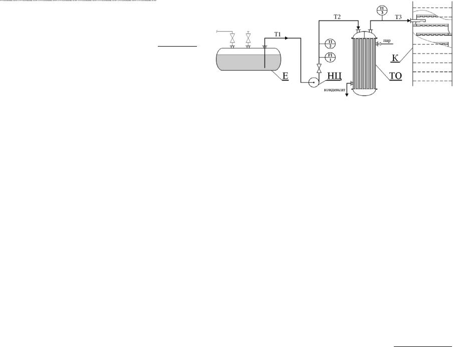 В ректификационной колонне К при атмосферном давлении производится разделение смеси двух жидкостей. Для обеспечения процесса разделения жидкая смесь перекачивается с массовым расходом G из ёмкости Е, работающей при атмосферном давлении, в ректификационную колонну с помощью центробежного насоса НЦ. В вертикальном кожухотрубном теплообменнике ТО смесь нагревается водяным насыщенным паром от начальной температуры t 1 до температуры кипения смеси при атмосферном давлении, и поступает в ректификационную колонну К.