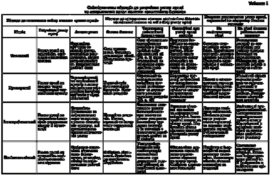 Отже, характеристики трудових ресурсів мають відповідати й регіональній промисловій, інвестиційній, фінансовій та іншим політикам. Для реалізації такої відповідності пропонується створення механізму забезпечення економічної безпеки, орієнтованого на всі ієрархічні рівні економічної системи. Орієнтуючись на класичне визначення управлінського механізму, його можна представити як сукупність певних важелів та інструментів. Для рівня національної економіки сукупність зазначених складових була представлена у табл.1. Разом з тим, зазначена ієрархічність потребує деталізації таких заходів в розрізі означених на рис.1 видів безпеки ринку праці та стадій процесу відтворення робочої сили. Авторський варіант такої деталізації представлено у табл.2.