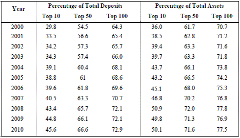 Доля активов и депозитов под контролем банковских структур, 2000 - 2010 гг., %
