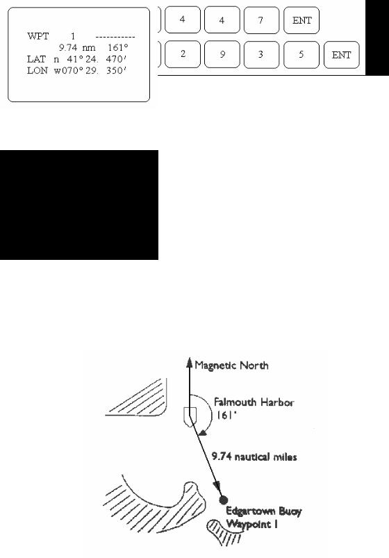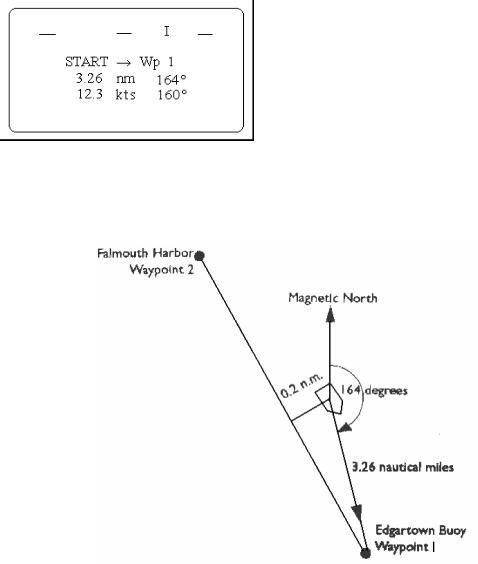 Теперь дисплей в режиме waypoint. На нем (см. рис. 14) показывается расстояние до буя и угол магнитного азимута от счислимого места до путевой точки, что соответствует следующей диаграмме (см. рис. 27):