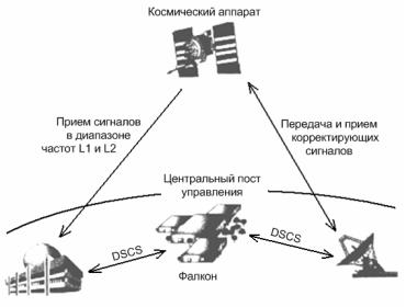 Стационарные контрольные посты – станции слежения - пассивно сопровождают все спутники GPS (видимые ими в любой момент времени), принимают от них сигналы и осуществляют специальные прецизионные измерения дальности до НКА. Затем эта информация передается на центральный пост управления в Колорадо-Спрингс через безопасный канал связи DSCS (Defense Satellite Communication System - защищенный канал спутниковой связи) (см. рис. 6). Главная станция осуществляет сбор измерений от всех КС. Там все измерения обрабатываются. По ним осуществляются точные расчеты параметров орбит, ионосферной модели и корректирующих поправок для бортовых часов, которые с главной станции через земные станции связи (атолл Диего-Гарсиа, о. Вознесения, атолл Кваджелейн) совместно с данными обработки метеорологической информации, позволяющей уточнить параметры модели тропосферы, передаются на борт каждого НКА. Производится также мониторинг состояния НКА и управление их работой.