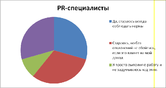 Комментарии: на графике мы видим, что количество специалистов, которые соблюдают и нарушают нормы, примерно равны. Это говорит о том, что роль этики в области PR не настолько незначительна, как мы предполагали. Достаточный процент работников старается соблюдать этические нормы. С другой стороны, ситуация далеко не идеальна, и задачей всех PR-специалистов должно стать совершенствование в морально-этическом плане, отстаивание этических норм в профессии.