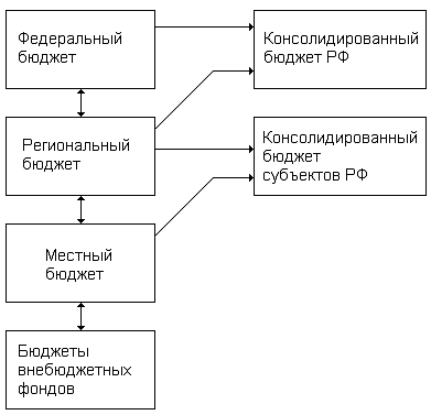Консолидированный бюджет РФ представляет собой федеральный бюджет и консолидированные бюджеты субъектов федерации, которые в свою очередь включают в себя региональные и местные бюджеты.