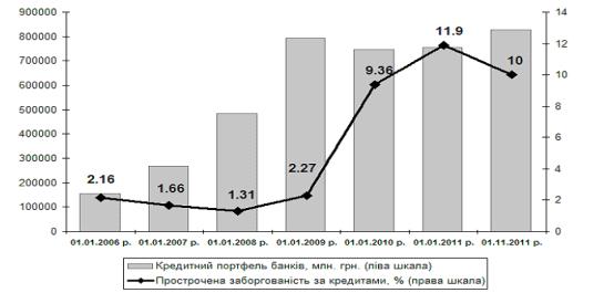 Рис. 2.2 Динаміка кредитного портфеля та проблемних кредитів банків України в 2006 -2011 рр. [17]