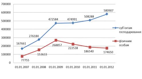 Як видно з динаміки кредитування у період з 01.01.2007 року по 01.01.2009 відбувається стрімкий ріст наданих банківських кредитів юридичним особам і більш плавне зростання обсягів кредитів, наданих фізичним особам, що збільшує розрив сфери виробництва та споживання. Починаючи з 01.01.2009 до 01.01.2012 кредитування юридичних осіб поступово розширюється, тоді як надані кредити фізичним особам зменшуються, що насамперед пов’язано з вищим ступенем довіри банківських установ до юридичних осіб [18].