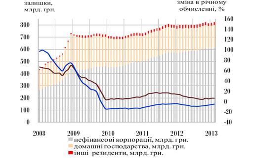 Зазначимо, що банківські кредити виступають не тільки одним з джерел залучених коштів для підприємств, але є і певним економічним індикатором, за допомогою якого можна говорити про переважний розвиток того чи іншого сектору національної економіки. Як видно з рис. 2.5, загалом спостерігається тенденція спаду надання кредитів нефінансовим корпораціям та домогосподарвстам до 2010 р. після чого бачимо деяке підвищення і знову спад. Так якщо з 2008 по 2009 рік банки надавали перевагу кредитуванню домашніх домогосподарств над нефінансовими корпораціями, то починаючи з 2009 р. і до цього часу спостерігається зменшення кредитування домашніх господарств та збільшення величини кредитів наданих нефінансовим корпораціям.