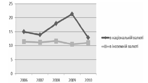 Аналізуючи графік на рис. 2. 6 можна зробити висновок, що відсоткова ставка по кредитам в національній валюті почала стрімко зростати у 2007 р. і ця тенденція продовжувалась до 2009 р. після чого почався деякий її спад. Плавність зміни кривої відсоткових ставок по кредитам, які надавались в іноземній валюті вказує на більшу стабільність кредитування в іноземній валюті, аніж в національній.