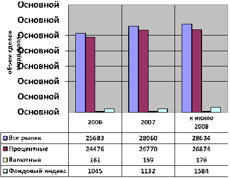 Объем торгов фьючерсами с 2006 г. по сентябрь 2008 г. рос, наряду с расширением рынка. Это было по большей части связано с повышением экономической активности и на фондовом рынке, и в реальном секторе. Так как фьючерс выступает как инструмент хеджирования рисков на этих рынках, то рост фьючерсов был неизбежен.[5]