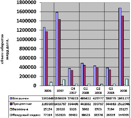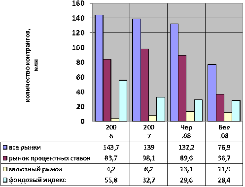 Валютные фьючерсы растут. В период 2006-2007 гг. прирост составил 95 %. Но в период с 2007 г. по сентябрь 2008 г. прирост составил 45 %. Как следует из диаграммы, к июню количество сделок находилось на более высоком уровне. Но далее шло сокращение на 10 %. Так как уже после июня ожидания стали меняться, рынки стали сужаться после первого полугодия.[5]