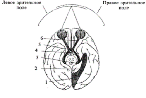 латеральное коленчатое тело; 4 зрительный тракт; 5 - зрительный перекрест; 6 -