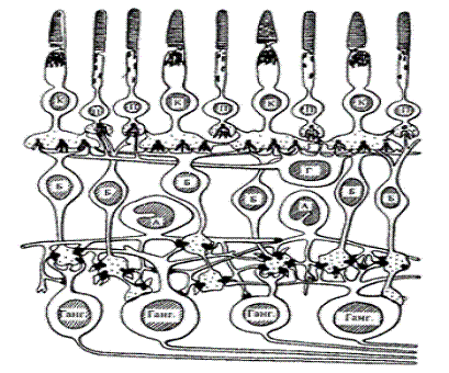 Общая схема нейрофизиологических процессов, протекающих в сетчатке, выглядит следующим образом: