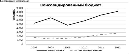 Тенденция поступления доходов от прямых и косвенных налогов отражает спад прямых налогов в 2009г.: поступления уменьшились на 1 841,5 млн. руб., по сравнению с 2008 г. Далее поступления прямых налогов только увеличивались, в 2012г. поступления составили 8 179, 5 млн. руб.