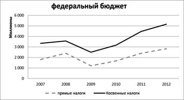 В 2009 г. косвенные налоги, впервые за анализируемый период, незначительно, но все же перевесили поступления прямых налогов.