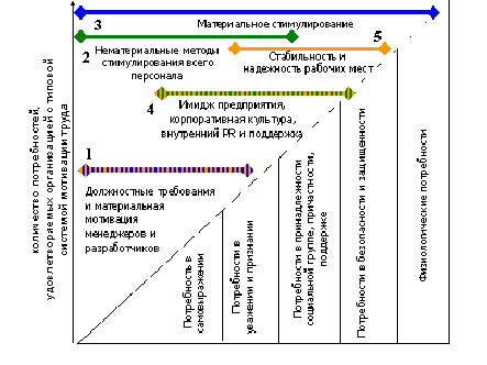 Некоторые потребности могут и должны удовлетворяться только материально, что-то - только морально, но подавляющая часть потребностей может быть удовлетворена только комбинацией моральных (в т. ч. организационных, т.е. заведомо заложенных в системе управления) и материальных факторов. При этом важным является то, что различные категории работников должны мотивироваться по - разному. Соотношение морального и материального стимулирования для бухгалтерии и отдела продаж должно быть принципиально различным. Определение этого соотношения лежит в тщательной формулировке целей конкретного подразделения или работника в разрезе общих целей компании. Поскольку работников - много, и целеполагание для каждого из них должно быть в русле общих целей организации, то логично предположить существование некой общей системы мотивации, применимой к каждому работнику. Факторы стимулирования и мотивации труда могут быть классифицированы по формулировкам потребностей в иерархии по Маслоу: Потребность в самовыражении. Одна из наиболее критичных потребностей. Известно, что творчество является «метамотиватором» наравне с «поиском истины», «служением другим» и «опекой». Такие «метамотиваторы» необходимо держать под контролем, а еще лучше - управлять ими. Для решения этой задачи следует использовать: Организационные рычаги (линия 1), такие как вменение в обязанности топ менеджеров и творческих специалистов работы (участия) в составе комиссий, советов, комитетов или рабочих групп, ведение проектной работы; Нематериальные (линия 2) методы стимулирования персонала в части формирования клубов, кружков, команд, любительских театров и т.д. К сожалению, многие менеджеры не считают это эффективным вложением денег. Тем не менее, формирование общих целей (спортивных, соревновательных, созидательных, творческих и т.д.) существенно влияет на общий командный дух коллектива, сплачивает и мотивирует его. Материальные методы (линия 3) - стимулирование рационализации и изобретательства, кружков качества, поддержка при значимых событиях в жизни работника, подарки и т.д. При справедливой оценке творческого вклада работника его лояльность и стремление работать для компании существенно повышается. Потребность в уважении и признании. В основном такая потребность существует у менеджмента компании, для которого движущей силой является статус. Характерно то, что основное мотивирующее (или демотивирующее) воздействие оказывает, в основном, сравнение с работниками соседнего предприятия, входящих в социальную группу респондента. В рамках управления этой потребностью следует применять: Организационные рычаги (линия 1), показывающие менеджеру возможность профессионального роста и достижения более высокого общественного положения (статуса), что является основным при стимуляции менеджеров; Нематериальные рычаги (линия 2), такие как название должности (статус), почетное членство в различных ассоциациях, публикации статей, использование на выставках как представителя компании, звания лучшего по профессии, грамоты и благодарности, путевки, социальная сфера и т.д.; Материальные методы (линия 3) - стимулирование активности работника, конкурентный уровень оплаты труда, поддержка при значимых событиях в жизни работника, подарки и т.д. Имиджевые рычаги (PR, линия 4) - общи