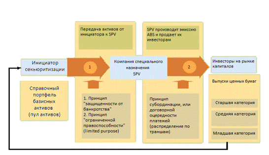 На втором этапе SPV разделяет активы по траншам согласно принципу субординации, выпускает обеспеченные этими активами ценные бумаги и предлагает их инвесторам на рынке ценных бумаг.