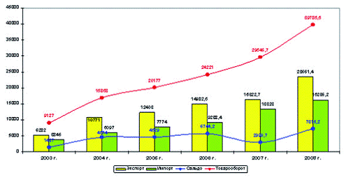Россия является крупнейшим торговым партнером Украины. За период 2002-2008 гг. товарооборот между Россией и Украиной увеличился более чем в четыре раза (рис. 3). При этом у Украины наблюдается хронический дефицит торгового баланса в торговле с Россией: ежегодно объем российского импорта на Украину превышает объем украинского экспорта в Россию.