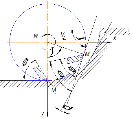 Направление движения режущей кромки зуба в каждый момент времени совпадает с направлением касательной к ее траектории. Направление этой касательной и касательной к окружности роторного колеса, определенной по режущим кромкам зубьев, совпадает лишь нижнем положении режущей кромки (точка М0, рис. 2.5).